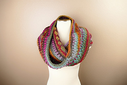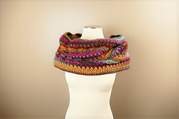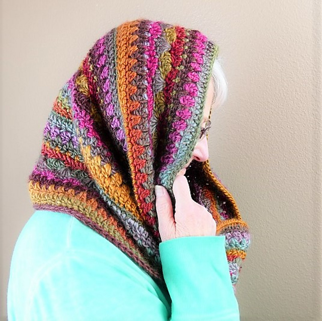 This crochet pattern for a self-striping hooded cowl is full of interest with texture, color, and softness and can be worn as an infinity scarf or as a head wrap.
