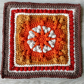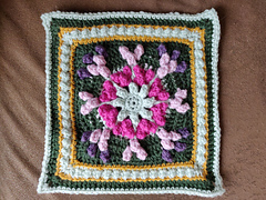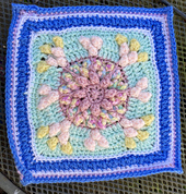 This is an intermediate square with Popcorns, a few post stitches, and basic crochet stitches.
