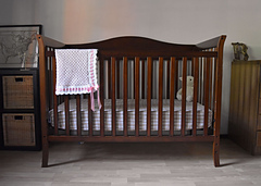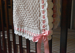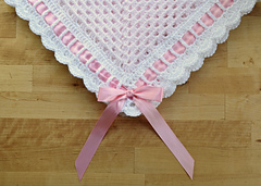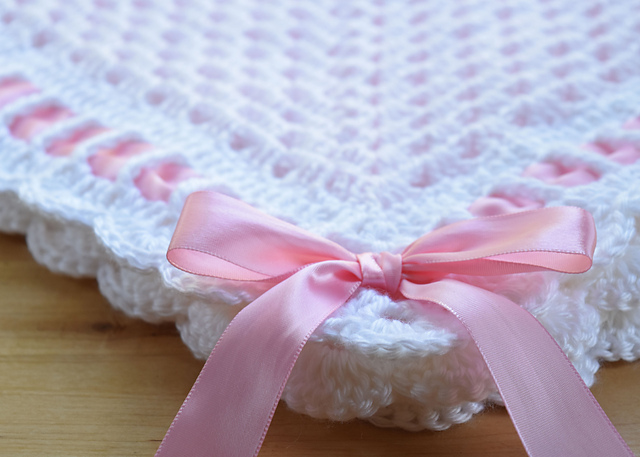 This crocheted baby blanket pattern uses an infinite granny square stitch, creating a simple delicate texture. The border uses single, double and triple crochets, as well as the shell stitch to create a classic yet ornate scalloped edge.