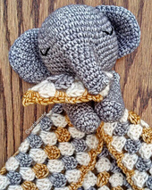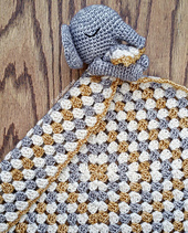 Hans the Elephant Comforter, is a crochet lovey attached to a granny square blanket. Perfect for teaching new babies to snuggle, bringing them comfort and sweet dreams. A perfect gift!