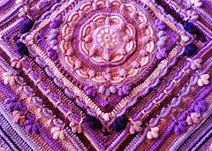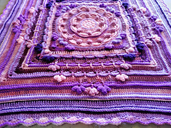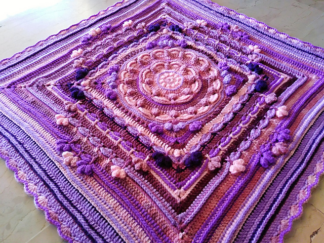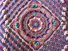 The sample size 42 rounds (including border) = 30 in (75 cm) square (before blocking). You can make a blanket bigger by adding the repeated rounds at the end.