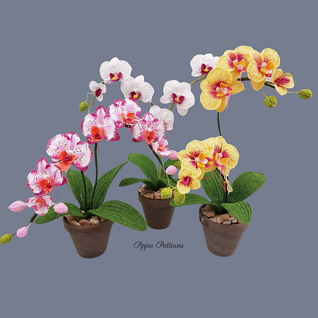 Easy to follow Step-by-step instructions and detailed photo guide with 100 + high resolution images that will explain each step on how to crochet and assemble and paint (optional) every part of this Moth Orchid. The Pattern includes 2 sizes of flowers, 3 sizes of buds, and 2 sizes of leaves and painting instructions if you would like to paint your flowers. You do not need to paint them. You can make your orchids just as pretty without painting.