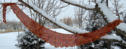 The stitch pattern is a simple four-row repeat for the first section and a two-row repeat for the second section, and forms a shallow crescent shape. The bottom edge of the scarf forms a gently-scalloped edge that appears as you crochet through the rows.