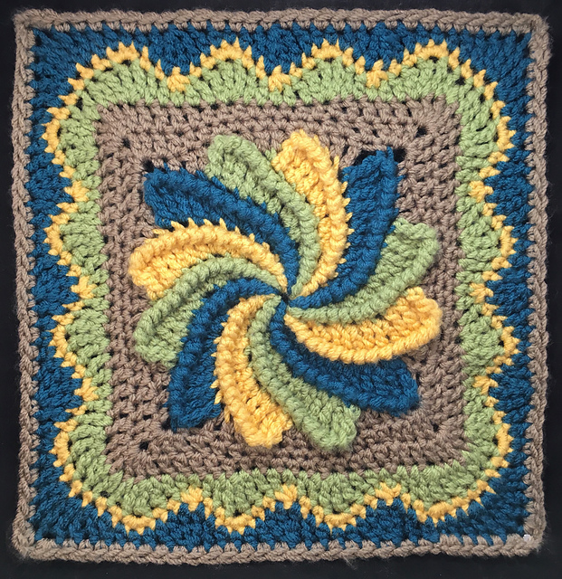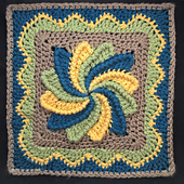 Get spun with this fun and colorful Pinwheel blanket square. Each petal is worked out from a center ring, then back in to opposite direction without turning to form the raised edges. The reverse single crochet edge is worked into the front loop only, leaving the back loop to stitch into for the next petal. This idea may have you spinning, but follow the instructions step by step and give it a try!