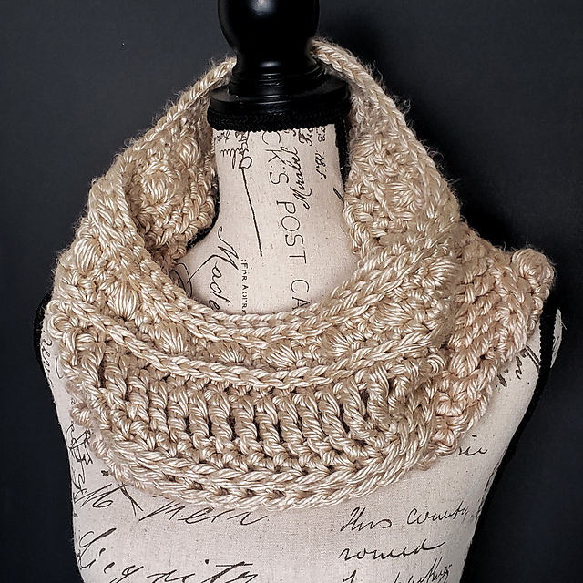 This cowl works up so quickly, you’ll be done before you know it. It’s a perfect last minute gift or treat for yourself, and a wonderful palate cleanser between larger projects. The treble crochet stitches give it a great drape, with 3rd loop hdc and puff stitches add an irresistible texture.
