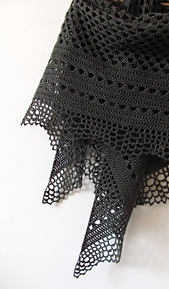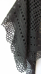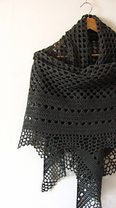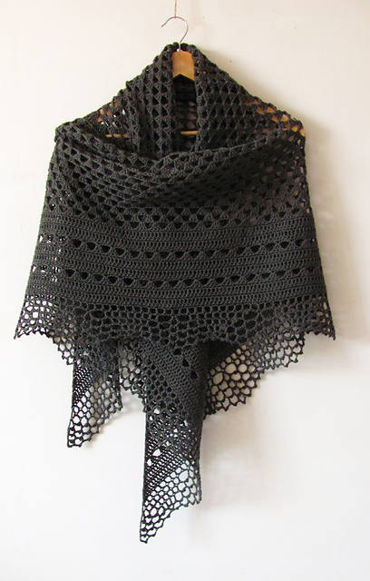 Echo Forest is a feminine triangle-shaped shawl worked top-down as one piece. A classic half granny square decorated with solid panels and crispy edging.