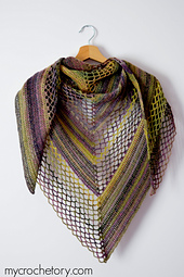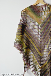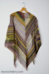 The Flores Shawl is worked the top-down in two stitch patterns creating an asymmetrical look. Different pattern on each side of row provide an interesting to crochet project. One side of the row is worked in double crochet stitches while the other side is worked in mesh stitch.