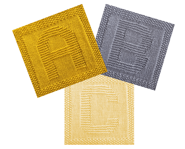 Patterns for a knitted alphabet squares. Great as a dishcloths or washcloths or with other squares to form a blanket or afghan. There are lots more free knitted square patterns available on my website too.