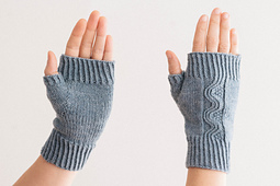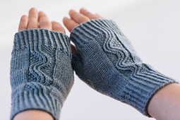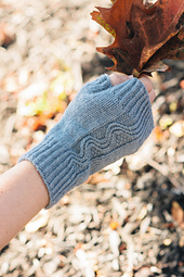A fingerless mitt pattern showcasing a traveling twisted-stitch wave flanked by reverse stockinette and seed stitch.