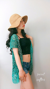 The Beach Breeze Kimono Top is a short-sleeved cardigan that is perfect for the warmer Spring and Summer seasons! It works beautifully as a lacy swimsuit cover-up. You can also wear it as a light shrug over a casual tank and shorts, or pair it with a summer dress! The finishing directions also allows for an alternative “poncho” (pullover top or tunic) style with open sides with seamed front and back pieces.