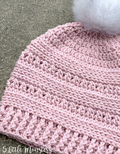 Half double crochet stitches and crossed double crochet stitches create the texture on this hat. It is finished with a post stitch ribbing around the bottom and a faux fur pom pom on the top.