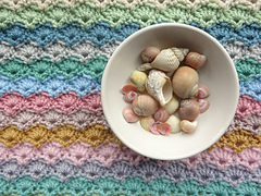 I settled on a delightful variation of a shell pattern where the stripe is worked in two rows - first you create a row of v-stitches, then you infill the v-spaces with shells - it really is a beautiful pattern to crochet. This pattern creates a delicious texture, and best of all the blanket is different on both sides, making it double sided, squishy and visually very lovely indeed.