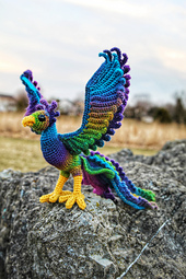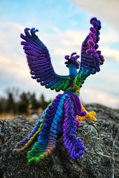 This Phoenix is ready to take off and burn its way to fabulousness. This pattern features easy customization as you can choose how to ornament the head and what feathers to use for the tail. You can make a classic Phoenix or let your imagination run wild -- Make a rainbow paradise guardian! Make an ice phoenix! Make a midnight sky galaxy bird! The choices are unlimited. The gauge is not crucial to the pattern as long as the stitches are tight enough to hold stuffing.