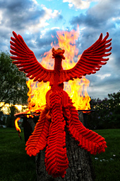 A Phoenix from this pattern is approximately 6 inches tall standing from toes to the top of the head, it is approximately 7 inches long from the butt to the beak, and the wing span is approximately 16 inches.