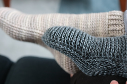 You can use any kind of sock yarn 50g/210m or 100g/420m but be sure to check your gauge for a good fit. The blue version is made with Lang yarns Jawoll (50g/210m), color: 0020 and the grey version is made with Lang yarns Supersoxx color Cashmere (100g420m), color: 0020.