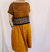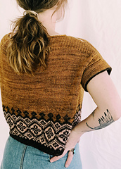 Navelli is a relaxed lightweight summer sweater, knit in the round from the bottom up and featuring colorwork at the body hem and folded sleeves with a tiny peek of contrast color for visual and structural interest. The front and back are separated at the armholes and worked flat with short row shaping at the shoulders. Named for an ancient town in Italy, known as the land of crocuses and saffron, this sweater is the third in my "Knitaly" series of designs (following [Tegna][3] and [Marettimo][4]).