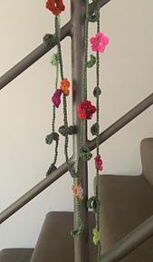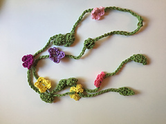 I love everything about daisy chains except for the fact that they wilt. So I crocheted these flower chains that will stay fresh forever. They’re made freeform crochet style – I have guidelines on how to make the leaves and flowers, but the order and frequency is up to you. You could make a vine with entirely leaves, entirely flowers, or a mix of both like I’ve done. They can be worn in your hair, turned into jewelry, used as bookmarks, and anything you decide. Wearing them in my hair makes me smile and I’ve gotten a surprising amount of compliments, which just goes to show that the world needs more bright and cheery flowers.