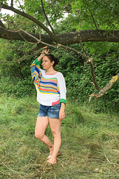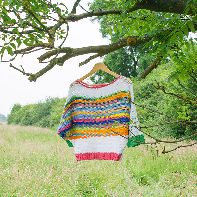 The item you see used a mixture of brands of DK cotton yarn but the project would also work with other fibres or a mix of both. The finished sweater is oversized so there is some flexibility with gauge to allow for mixing up your yarn!