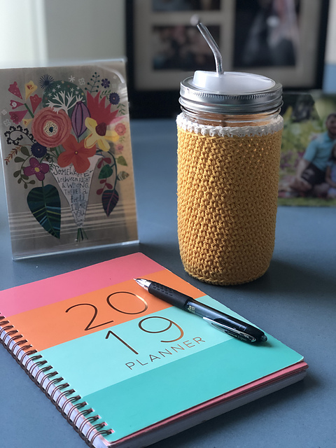 I'm so excited to share this pattern with you for free as part of my participation in #plasticfreejuly. Having a re-usable cup/jar/bottle is a great, yet simple, way to avoid needing to buy/use plastic. This is especially important at a time, when many recyclable items simply are not being recycled). The Lion Brand Re-up yarn is a great pairing for this project. [As they say on their website][1]: "It takes, on average, 20,000 liters of water to make 1 kilogram of cotton. By using one 70 gram ball of Re-Up you are saving 1,400 liters of water."