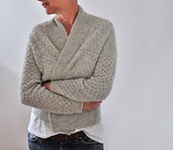 It is worked seamlessly from the top-down. Start working the collar separately. You first pick up and then CO sts for the back and shape the back neck with short rows. Continue to work the back for the length of the armhole. Pick up the stitches for the front and collar and work both fronts symmetrically for the length of the armhole. Join back and fronts to work the body in stitch pattern down to the bottom ribbing. Pick up the sleeve sts to work the sleeves in rounds in stitch pattern.