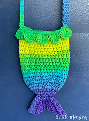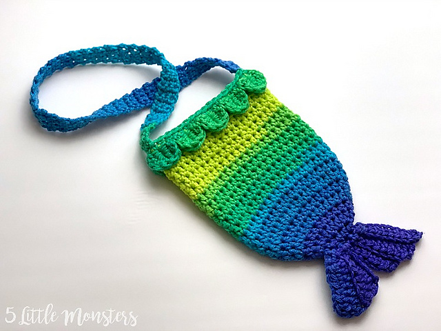 Crochet a child size mermaid tail purse with this free pattern. Worked from the fin up and finished with a round of crocodile stitch scales around the top. Easily adjust the strap to be as long or as short as you want.