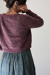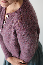 A cropped top down raglan cardigan with an eyelet motif incorporated into the raglan increases. This was designed to be the perfect sweater to wear layered over tunics and dresses, I like it with waisted pants as well. I suggest putting all the stitches on waste yarn and trying the sweater on before you begin the ribbing to be sure you have a length you will like and will enjoy wearing.