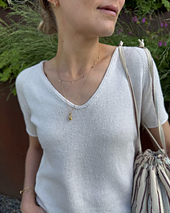 The Cumulus Tee is worked in stockinette stitch and has a rounded V-neck in the front. The sleeves are elbow length, and all edges are finished in i-cord. The Cumulus Tee requires no finishing work at the end.