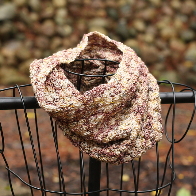 This is a beginner crochet pattern for a simple cowl. The pattern of single and double crochet stitches makes for a beautifully textured piece that looks more complicated than it is. The drape of a lightweight merino wool yarn, like this hand-dyed yarn from Knot Your Momma's Yarn (https://www.knotyourmommasyarn.com/) is perfect to give it a cozy but lightweight feel, perfect for fall walks in the cool air.
