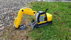 This pattern is worked mainly in sc. It includes intarsia crochet on the bonnet and side windows, but includes a full photo tutorial for those unfamiliar with this technique. Any yarn may be used, as long as all colours are of a similar weight and the hook is selected to give a firm fabric. Using DK yarn and a 3mm hook, my finished digger measured approx 25 cm long. For the digger shown I used: