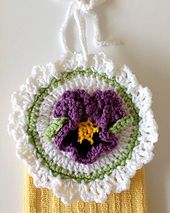 Celebrate the season in your kitchen with this delightful design featuring spring flowers. The Pansy Kitchen Set Crochet Pattern gives your kitchen a splash of bright color with a clean linen look. The pattern set includes Towel Topper, Potholder, Napkin Ring, Vase and Flowers, Placemat, Casserole Cover and Fridgie. All pieces in the set complement each other with a lace-inspired design adorned with colorful pansies. You can make them all or choose just your favorites. These items are as functional as they are pretty.