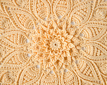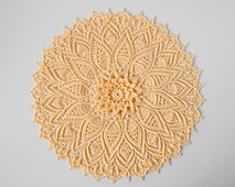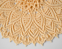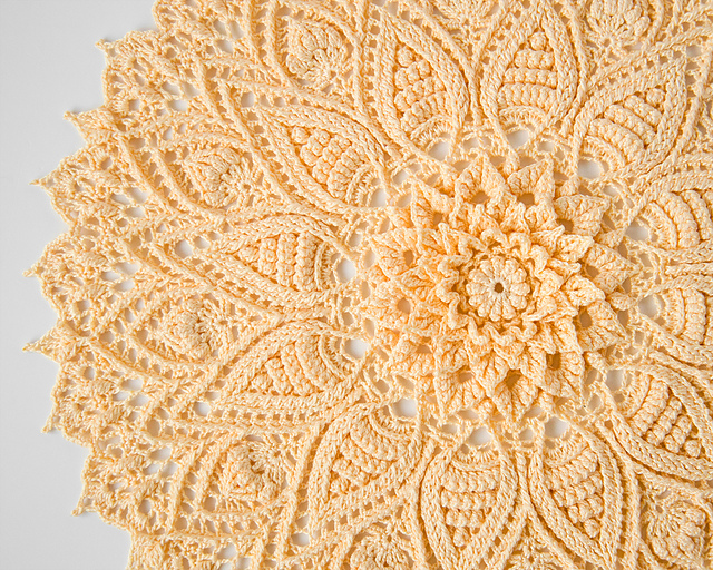 Your tension will determine things like hook size, yardage, finished size, and height of stitches. Using recommended thread and hook this pattern will use approximately 550-600 yards of thread. And your finished doily will be about 14’’ in diameter from point to point.
