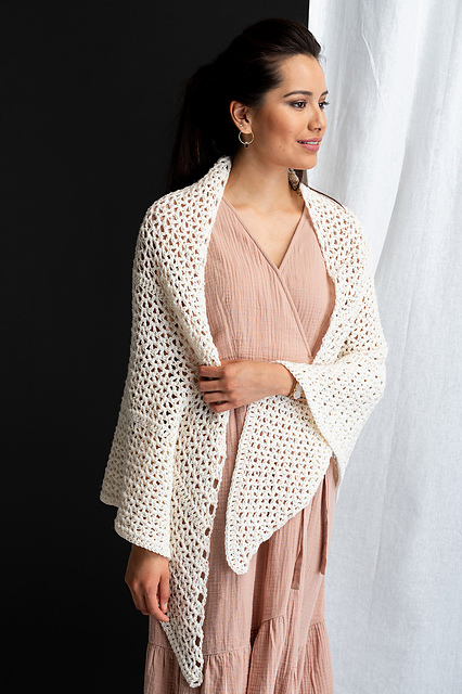 The perfect meditative project for crocheters of all skill levels, this shawl features lacy V-stitches punctuated by solid rows. Inspired by a minimalist aesthetic, the classic triangular shape can look trendy when tied like a bandanna or more traditional when thrown over the shoulders.