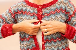This cardigan is worked back and forth in one piece to the underarms, following the Tonnach chart. Fronts and back are shaped separately, then joined at the shoulders, before the sleeves are picked up around the armscye and worked downwards, in the round. After working a ribbed neckband, the front edges are picked up, and finished with i-cord buttonholes / buttonbands. When one number is given it applies to all sizes
