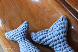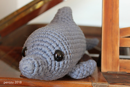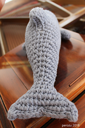 The dolphins in the pictures were made in Phil Aviso The small one was made with a 3.5mm hook, used up a little over one skein of yarn, and is about 25cm long. The larger one was made by doubling the yarn and using a 4.5mm hook, it used up a little less than 5 skeins of yarn and is about 38cm long.