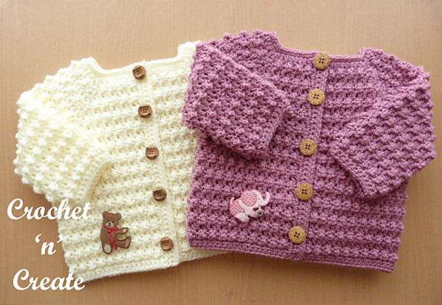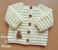Knobbly baby cardi – An ideal garment to slip on over a top, dress or boys shirt. The pattern for this design is in a raised textured stitch comprising of just two rows.