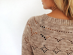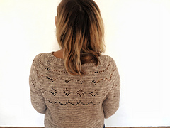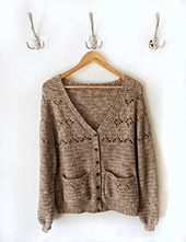 Candelaria, made for lounging, was inspired by my Abuelita Cande, whose favorite thing is to sit on a comfy corner of the house with a good book and a warm cup of tea. It is a seamless top-down raglan cardigan, which allows for customization and its oversized shape is perfect for keeping warm and being comfortable.
