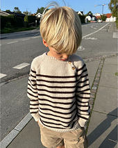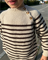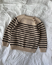 The Seaside Sweater is worked from the top down with raglan increases. The first part of the yoke is worked back and forth on circular needles, while the button placket is being created along the left front raglan line. After the button placket has been completed, the work is joined to continue knitting in the round on the circular needles. The Seaside Sweater is worked in stripes from the middle of the yoke and downwards.