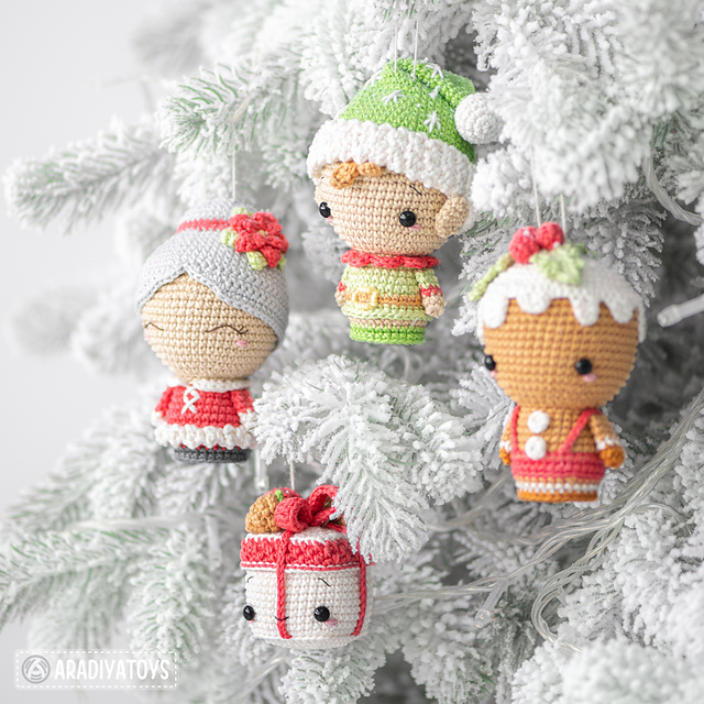 Christmas Minis set 2 – tenth pattern from the “AradiyaToys Minis” collection, second pattern specially dedicated to the Christmas holiday. These toys are perfect as Christmas decorations. The pattern describes how to create the four toys: Mr Christmas Elf, Mrs Claus, Mr Gingerbread and Mr Christmas Present.