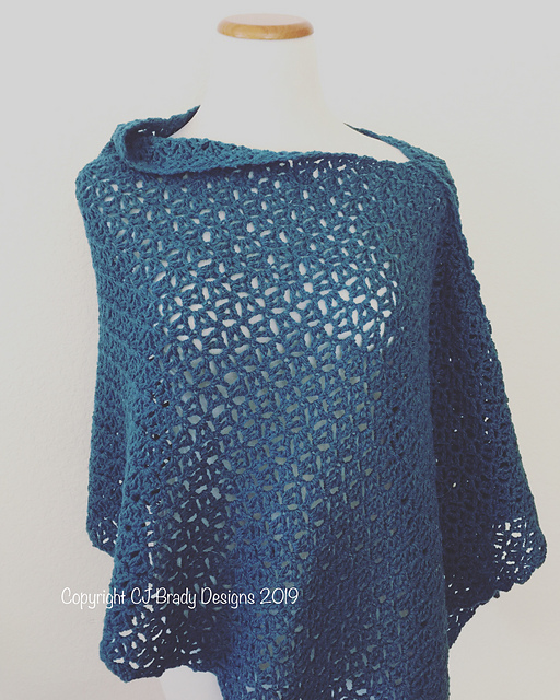 I crocheted my poncho in a sport weight yarn that gives the poncho a beautiful drape. The stitch pattern starts with what I call a “starting sequence” that is much quicker and easier than crocheting a long starting chain. And, it adds a nice scalloped edge to the starting edge rather than a straight edge, so that the starting edge will match the final scalloped edge.