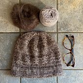 *Leni* is a casual hat, worked in the round from the folded brim to the top. Combining one strand of mohair lace and one strand of fingering weight merino results in a soft and sumptuous look, but any other yarn that gives you the right gauge will work just fine. The hat is started with a provisional cast on and some ribbing which is then hidden when the main body of the hat is worked. A small delicate band of texture comes next and adds just the right amount of interest. An optional pompom is worked last.
