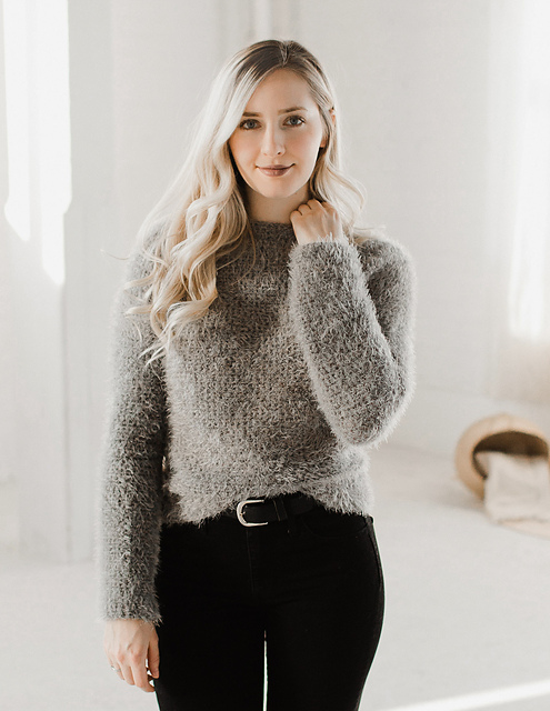 This chic winter sweater is crocheted with a textured novelty yarn to produce a fuzzy sweater reminiscent of those especially popular in the 90’s and early 2000’s. This budget-friendly yarn produces a beautiful sweater with an unexpected texture that can’t be achieved with regular yarn.