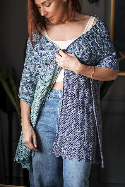 A reversible design with an easy-to-remember repeating pattern. The small zigzag (chevron) pattern creates a “peaks and valleys” design throughout the scarf/shawl. It also creates a natural progression where the ends flare out. I chose to focus on this aspect in my design and allowed the yarn to do what it wanted when I blocked the finished scarf/shawl.