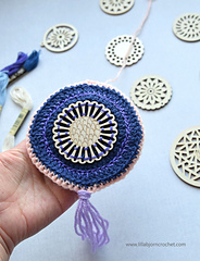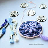 Micro Rozeta hanging ornament consists of two parts: top with textured overlay flower, and plain bottom. Wooden ornament is stitched onto the bottom part, a little embroidery is optionally added onto the bottom part, then both parts are crocheted together (and stuffed if desired).