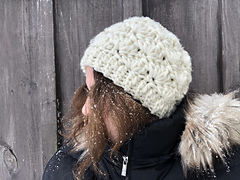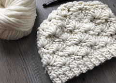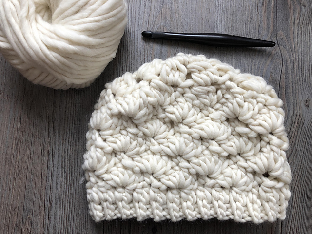 This crochet beanie is made with a super bulky weight yarn which means its super cozy and works up quick! The hat is worked from the bottom up and features a crochet shell stitch.